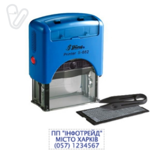 - У комплект самонаборного штампу входить: набір знаків S-655 (4мм) в кол-ве 1 шт; штамп синього, червоного, чорного кольорів з вільним полем 14х38мм; пінцет для набору знаків - 1шт; змінна подушка S - 852-7 синього кольору;